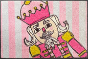 Add a playful pop of holiday cheer with the pink Nutcracker Doormat. Featuring a whimsical nutcracker in shades of pink and gold, set against a soft striped background. This mat brings a fun and festive twist to classic holiday décor.