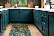 The Palm Leaf Teal Small Rugs and Runners have a palm frond pattern that brings a tropical vibe to any space. The dark teal green palm leaves on a tan background create a beautiful, natural look that’s reminiscent of grand garden estates.