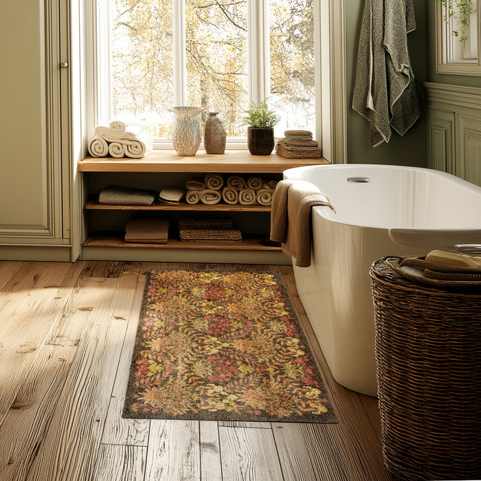 The Lush Garden Harvest Small Rugs and Runners bring a botanical elegance to any space with its intricate floral design set against a warm brown backdrop. Muted shades of red, rusted orange, and golden ochre create a striking contrast, evoking the beauty of a harvest blooming bouquet. The symmetrical pattern adds depth and sophistication, making it a perfect choice for cottage, eclectic, and traditional interiors.